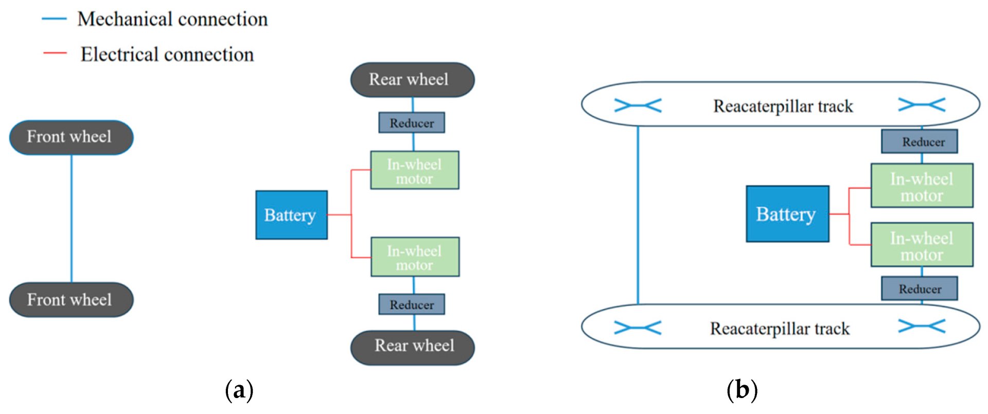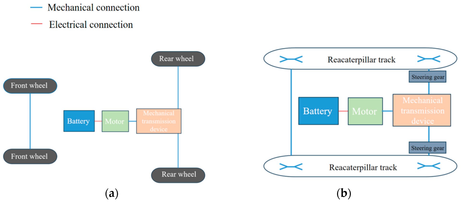 Figure 8. Schematic diagram of an electric tractor driven by a single motor: (a) wheeled electric tractor; (b) crawler-type electric tractor.