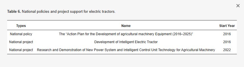 Table 6. National policies and project support for electric tractors.