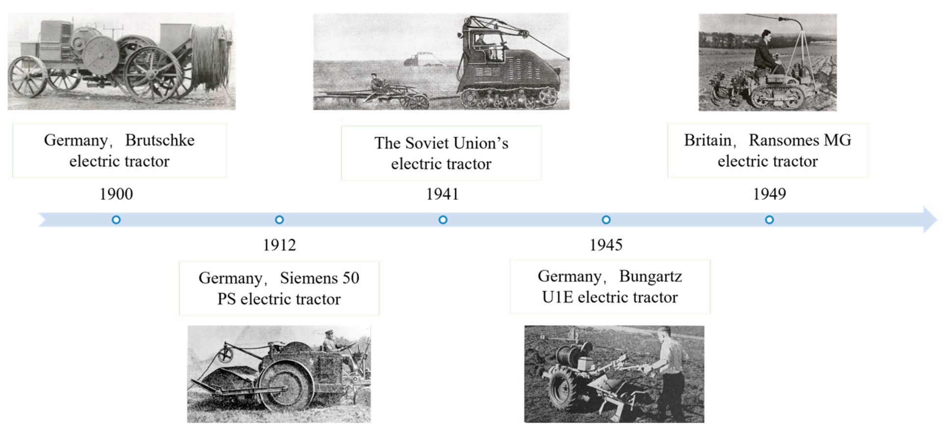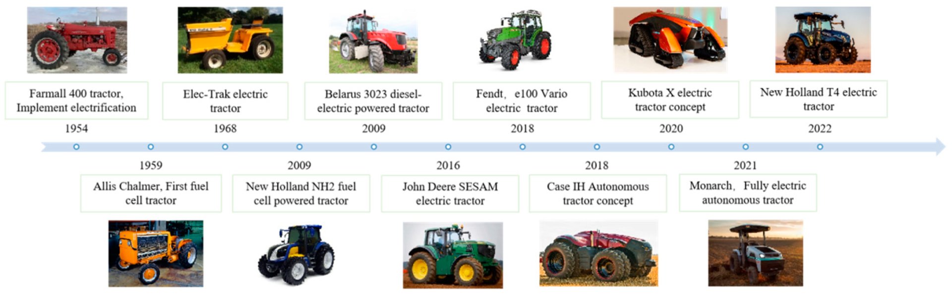 Figure 1. Historical timeline of electric tractors powered by power grids being used in agriculture.