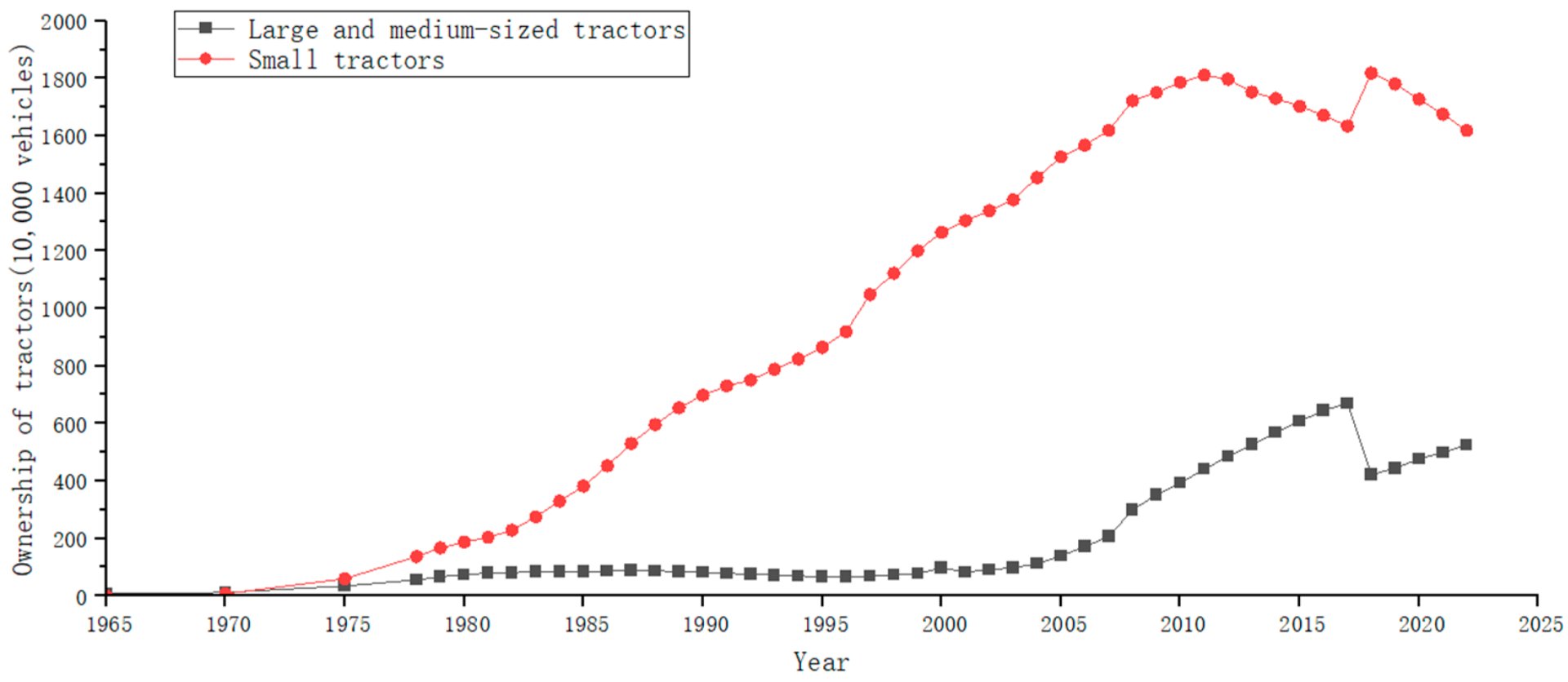 Note: The data are obtained from China Rural Statistical Yearbook, Beijing, 1980–2023, China Statistics Press. The classification standard for large- and medium-sized tractors and small tractors after 2018 has been changed from an engine power of 14.7 kW to 22.1 kW.