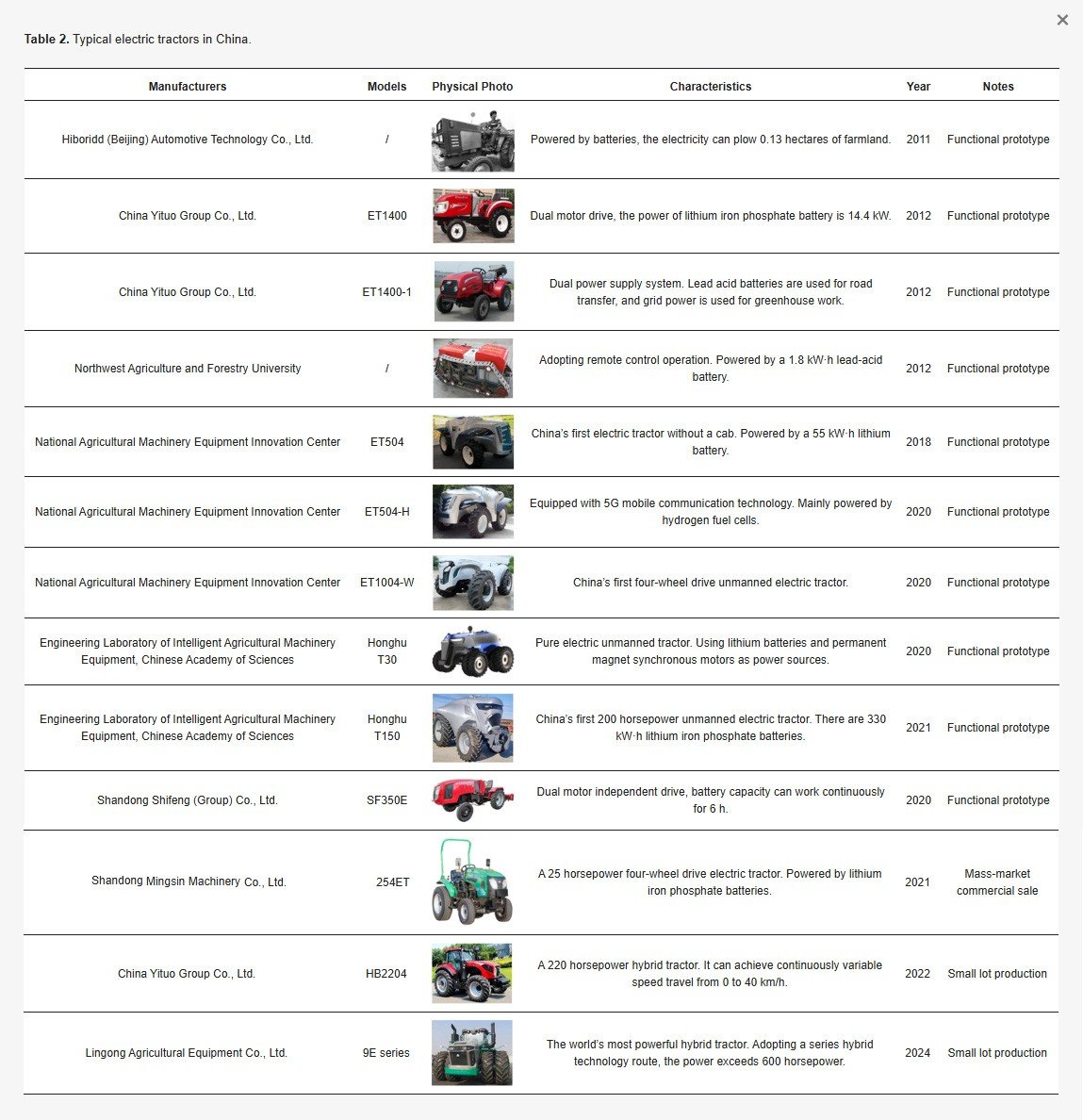 Table 2. Typical electric tractors in China.