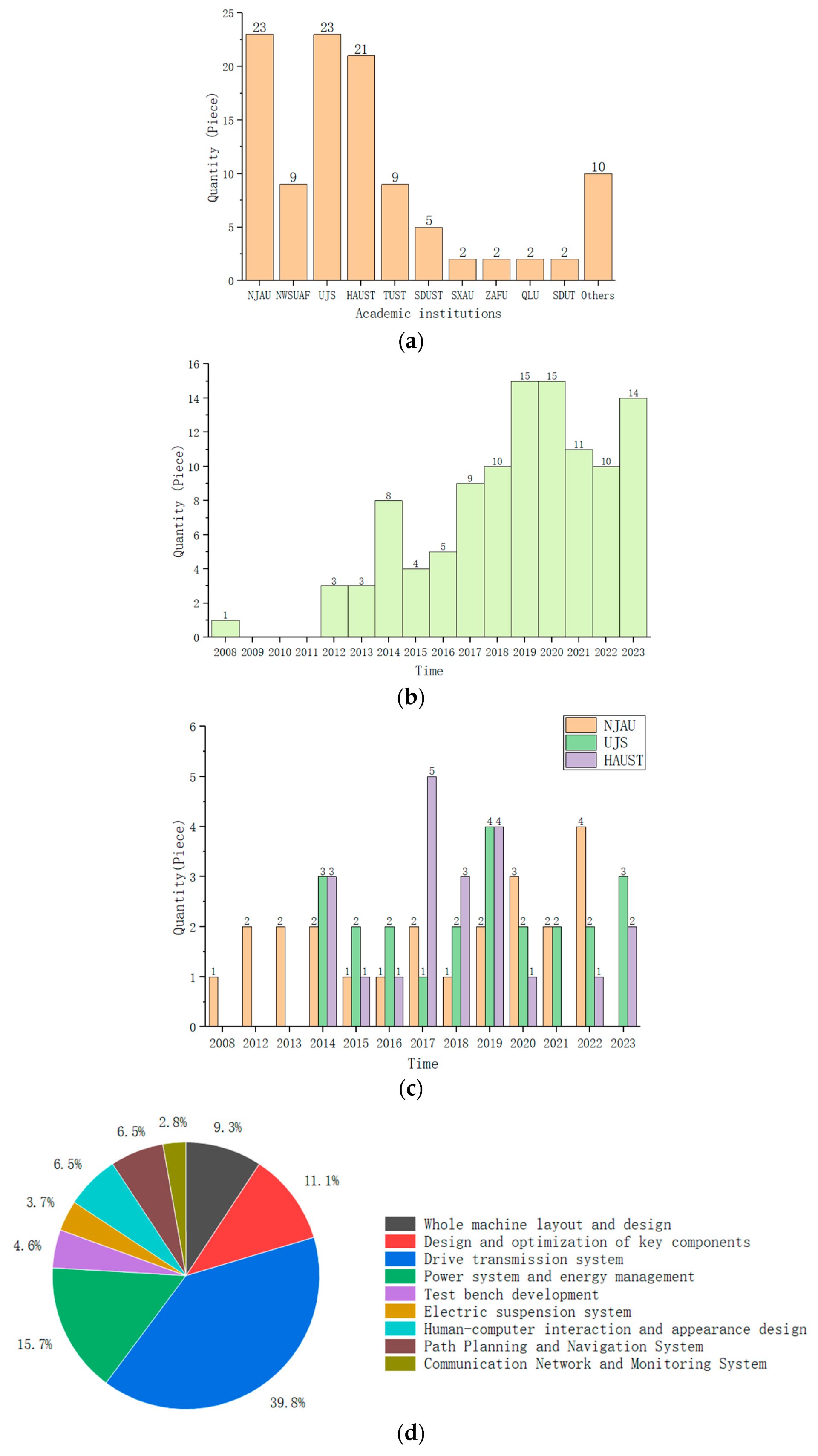 According to Figure 6a, the top three academic institutions with the highest number of graduate theses are NJAU, UJS, and HAUST. The sum of graduate theses from these three institutions accounts for 62% of the total. According to Figure 6b,c, the earliest graduate thesis was published in 2008 at NJAU. In both 2019 and 2020, there were 15 graduate students engaged in research on electric tractors. As shown in Figure 6d, the research content of these graduate theses mainly involves the drive transmission system and power energy management of electric tractors. Their proportion has reached over 50%. This indirectly indicates that the drive transmission system and power energy management are hot and difficult topics in the research of electric tractors. Overall, there are many graduate students in China engaged in research on electric tractors.